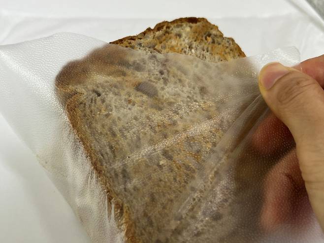 매직랩 끈적한 면이 바닥으로 가게 하여 샌드위치를 올리세요.