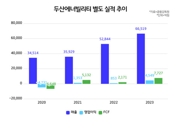 먼저 실적을 살펴보면, 2020년 두산에너빌리티는 별도기준 매출 3조4514억원, 영업손실 4731억원을 각각 기록했다. 2021년부터 흑자전환했으며 매출 규모도 확대되면서 큰 폭의 외형 성장을 이뤄냈다. 2023년 기준 매출 6조6519억원, 영업이익 4549억원을 내며 두산에너빌리티 자체 사업만으로도 성과를 낼 수 있다는 점을 입증했다.