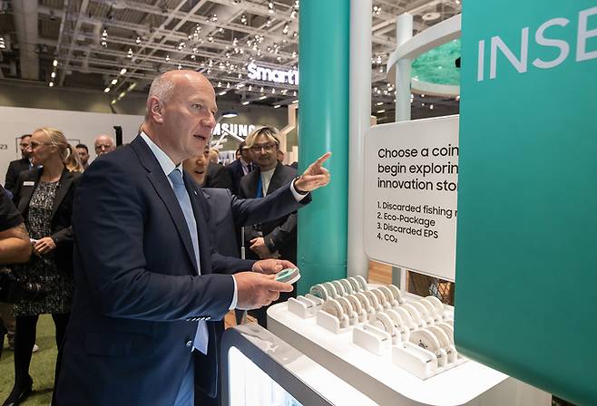 카이 베그너 베를린 시장(왼쪽)이 1일(현지시간) ‘IFA 2023’ 삼성전자 전시관에서 삼성전자의 다양한 친환경 노력을 소개하는 지속가능존을 둘러보고 있다.