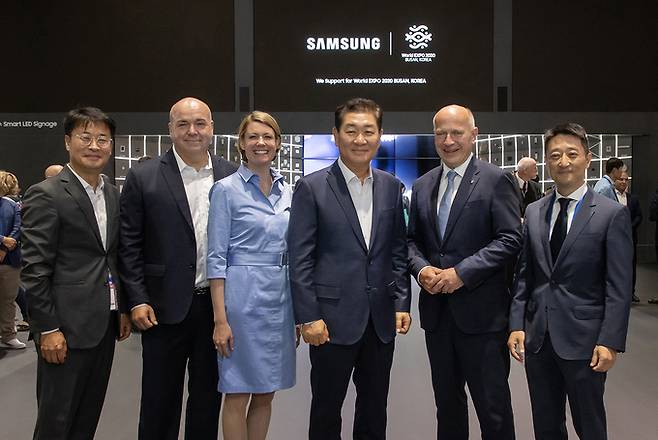 IFA 주관사 중 하나인 독일가전통신전자협회(GFU) 대표 사라 바르네케(왼쪽에서 세 번째), 삼성전자 대표이사 한종희 부회장, 카이 베그너 베를린 시장(오른쪽에서 두번째)이 1일(현지시간) 'IFA 2023' 삼성전자 전시관에서 기념 촬영을 하고 있다.