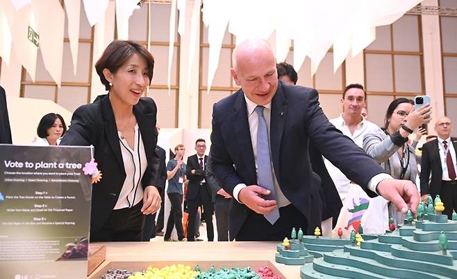 지난 1일(현지시간) 독일 베를린에서 개막한 ‘IFA 2023’을 찾은 카이 베그너 베를린 시장(오른쪽)이 LG전자 H&A브랜드커뮤니케이션담당 노숙희 상무의 안내로 LG전자 전시관을 살펴보고 있다.