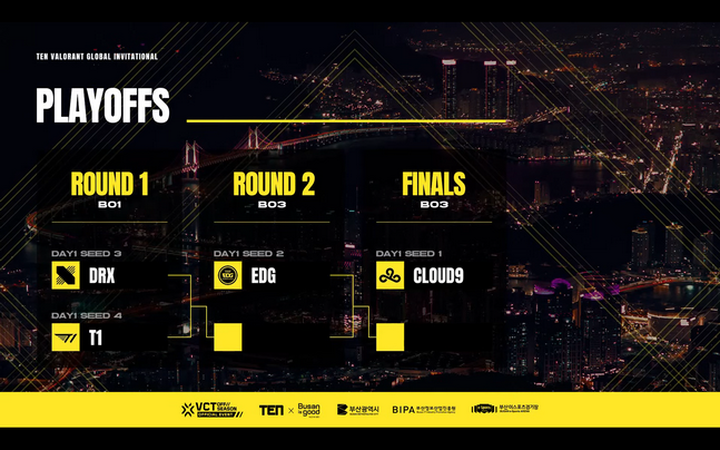 7일 부산광역시의 부산진구에 위치한 부산e스포츠경기장에서는 TEN 23시즌 ‘발로란트 글로벌 인비테이셔널’의 1일차 대회가 진행됐다. VCT 오프 시즌 공식 이벤트로 진행된 이날 행사는 VCT 퍼시픽 소속의 DRX와 T1, VCT 아메리카스 소속의 클라우드9(이하 C9), 2024 시즌에 새롭게 출범하는 VCT 차이나의 에드워드 게이밍(이하 EDG) 등 네 팀이 참가했으며 1일차는 참가 네 팀이 모두 한 번씩 단일 세트로 대결하는 라운드 로빈 방식으로 경기가 치러졌다.