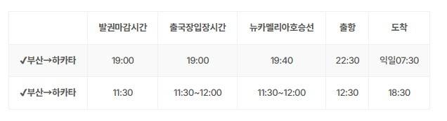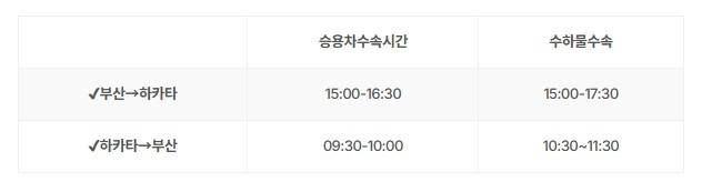 부산 출항 시간은 22:30 출발하여 익일 07:30에 하카타 도착이다. 또 하카타 출항 시간은 12:30 출발하여 18:30에 도착한다. 부산에서 하카타까지는 약 9시간이지만, 하카타에서 부산까지는 6시간 정도가 걸린다. 이는 밤과 낮 시간대 차이이므로 참고하면 된다.