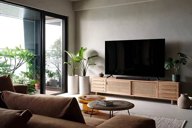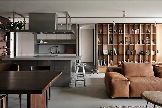 현관을 지나면 펼쳐지는 거실은 매트한 회색의 일관성과 깔끔한 마감으로 깊은 인상을 줍니다. 덴마크산 미네랄 페인트로 바닥, 벽, 천장이 끊김 없이 연결되어 차분하면서도 견고한 분위기를 조성합니다. 소파는 자유롭게 배치되어 좌석 간의 거리를 조절할 수 있으며, 천장의 높이를 다르게 하여 공간감을 더합니다.