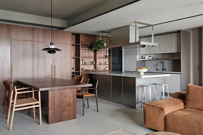 주방 옆 식탁 공간은 각기 다른 디자인의 의자가 배치되어 있지만, 통일된 색감으로 전체적인 조화를 이룹니다. 나무 소재의 긴 벽면 수납은 신발장, 와인 저장고, 오픈 선반이 자연스럽게 연결되며, 시선을 끌지 않는 배치가 돋보입니다.