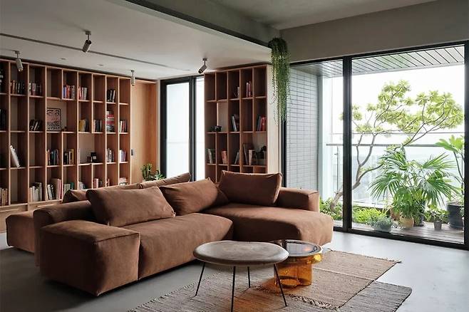 벽면을 따라 설치된 오크 원목 책장은 장식적 효과와 수납 기능을 동시에 제공하고, 창가를 따라 이어진 L자형 수납장은 낭만적인 휴식 공간을 형성합니다. 특히, 유럽에서 수집한 빈티지 조명과 가구는 집의 정체성을 은연중에 드러냅니다.