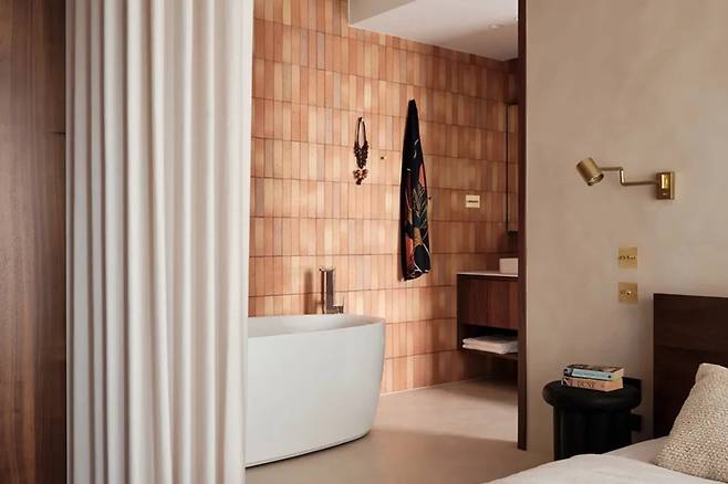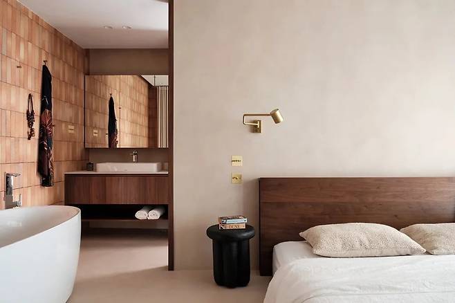 드물게 침실 옆에 자리한 욕조는 생활 동선에 신선한 변화를 주는 핵심 인테리어 요소입니다. 일본산 붉은 벽돌 타일로 마감된 L자형 벽면은 거칠면서도 따뜻한 느낌을 줍니다.