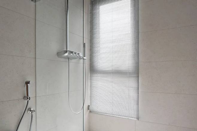 독립 세면대와 샤워 구역은 실용성과 세련미를 동시에 담고 있습니다. 회색의 깔끔한 타일 마감은 정돈된 느낌을 주며, 폴란드에서 가져온 수입 수전은 감각적인 포인트가 됩니다.