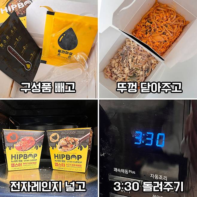 조리법은 시중에 있는 냉동식품과 동일해요. 구성품을 배고 전자레인지에 3분 30초 (700w 기준)만 돌려주면 끝!