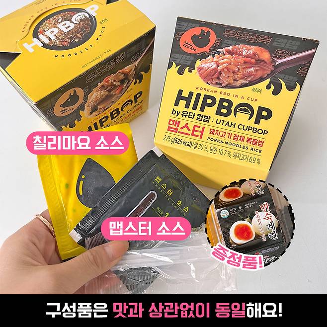 구성은 맛 상관 없이 동일해요. 칠리마요 소스, 맵스터 소스 그리고 일회용 숟가락이 들어있어요.