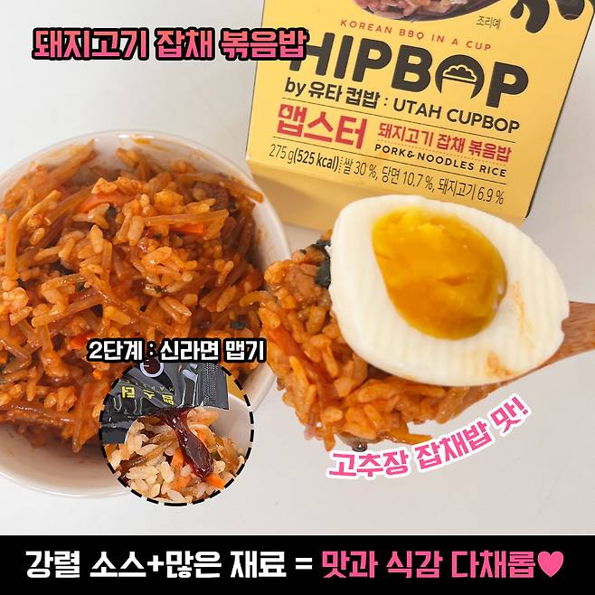돼지고기 잡채 볶음밥은 밥 자체도 빨갛게 양념이 되어 있는데, 소스까지 더해지니 맛이 꽤나 강렬해지더라구요? 맵기는 신라면보다 살짝 더 매웠어요.