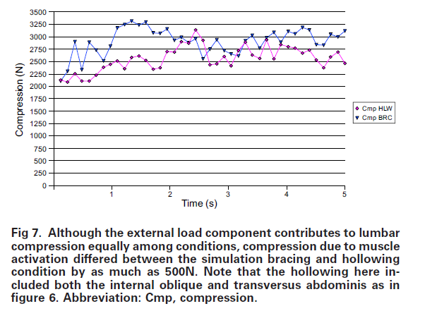 관련 비교논문을 보면 같은 부하내에서Hollowing보다 Bracing이 압도적으로 활성도가 높다고 하죠~(위에 글에서 보면 500N 만큼 차이가 난다고 하네요)Hollowing의 복횡근 선택적 수축은 실제로굉장히 어렵고 실제 근육의 활성도 측면에서도낮다는 것입니다~