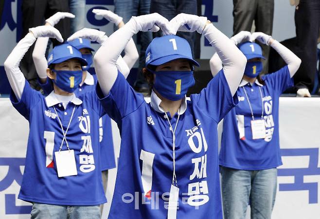[이데일리 노진환 기자] 더불어민주당 선거 운동원들이 대통령 선거 공식 선거운동 이틀째인 13일 구미역 광장에서 율동을 하고 있다