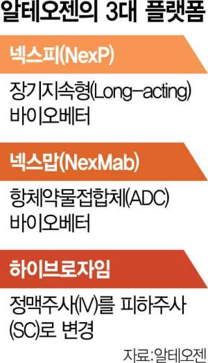 알테오젠은 정맥주사(IV)제형을 SC제형으로 바꿔주는 하이브로자임 플랫폼(ALT-B4)으로만 최근 6년간 10조 원이 넘는 기술 이전 계약을 따냈다. 지난해 하반기 불거진 미국 할로자임과의 특허 분쟁 이슈도 이달 17일 글로벌 빅파마인 아스트라제네카와 약 2조 원에 달하는 초대형 계약을 체결하며 불식시켰다. 박 대표는“하나의 기술을 지속적이고 반복적으로 이전할 수 있는 것이 플랫폼의 힘"이라며 “지난해에만 SC제형 플랫폼으로 1000억 원이 넘는 매출을 올렸다”고 전했다.