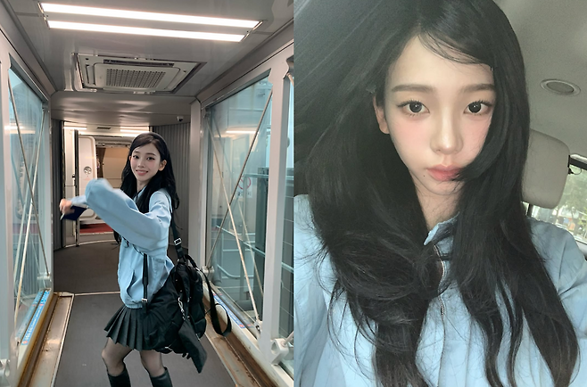 여기에 긴 생머리를 자연스럽게 풀어내리고 머리띠를 착용하여 청초하면서도 사랑스러운 하이틴 무드를 완성한 모습입니다.