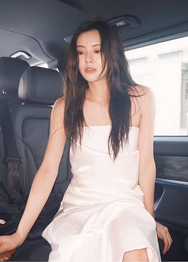 실키한 소재의 튜브톱 드레스를 착용해 부드러운 곡선을 살렸으며, 힘을 뺀 듯 자연스럽게 흐르는 헤어스타일과 톤다운된 메이크업으로 고요한 감성과 세련미를 동시에 드러냈습니다.