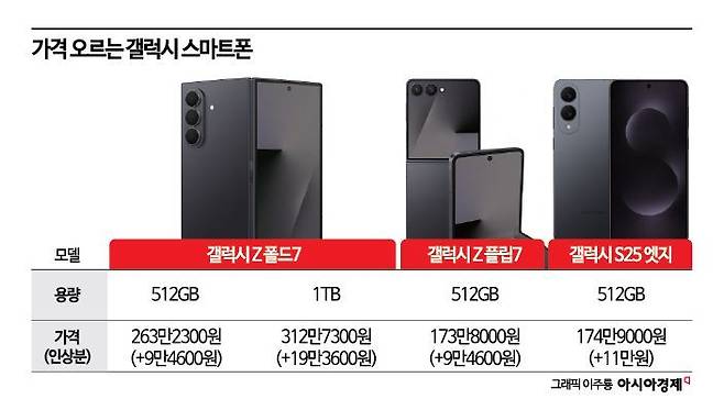 1일 삼성전자는 폴더블 스마트 갤럭시 Z 폴드7·플립7, 초슬림 스마트폰 갤럭시 S25 엣지의 고용량 모델 가격을 이날부터 인상한다고 밝혔다. 갤럭시 Z 폴드·플립7의 512GB 모델은 9만4600원, 갤럭시 S25 엣지의 512GB 모델은 11만원 인상됐다. 또 저장용량이 큰 갤럭시 Z 폴드7의 1TB 모델은 가격이 19만3600원 올랐다. 256GB의 저장공간을 가진 기본 모델들의 가격은 동결했다.