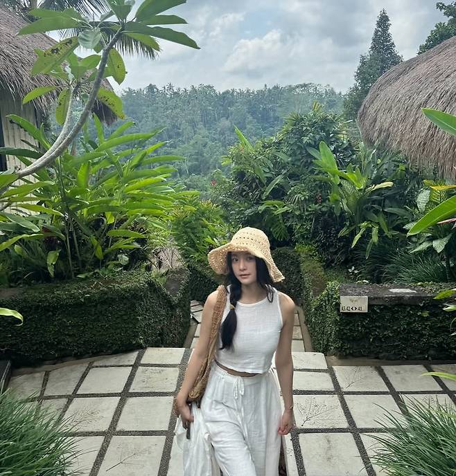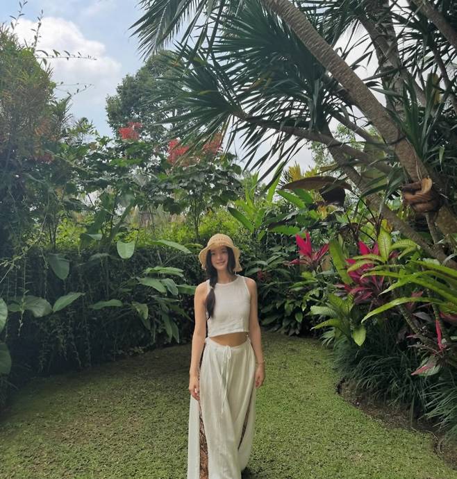 민소매 크롭 탑과 와이드 팬츠의 올 화이트 셋업을 매치해 자연스럽고 청량한 리조트 무드를 연출했습니다.