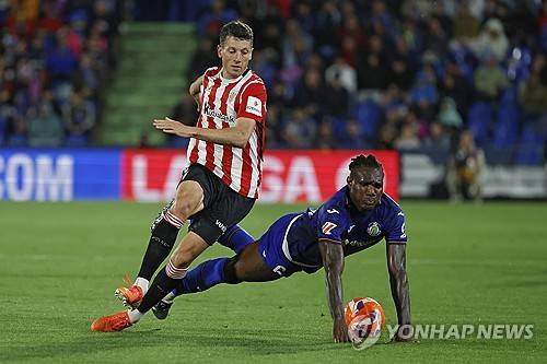 epaselect epa12104179 Getafe's Christantus Uche (R) and Athletic's Mikel Vesga in action during the Spanish LaLiga soccer match between Getafe CF and Athletic Club Bilbao, in Madrid, Spain, 15 May 2025. EPA/MARISCAL