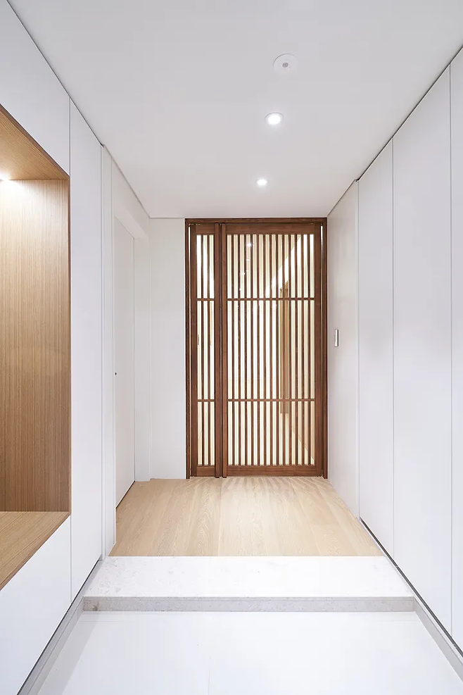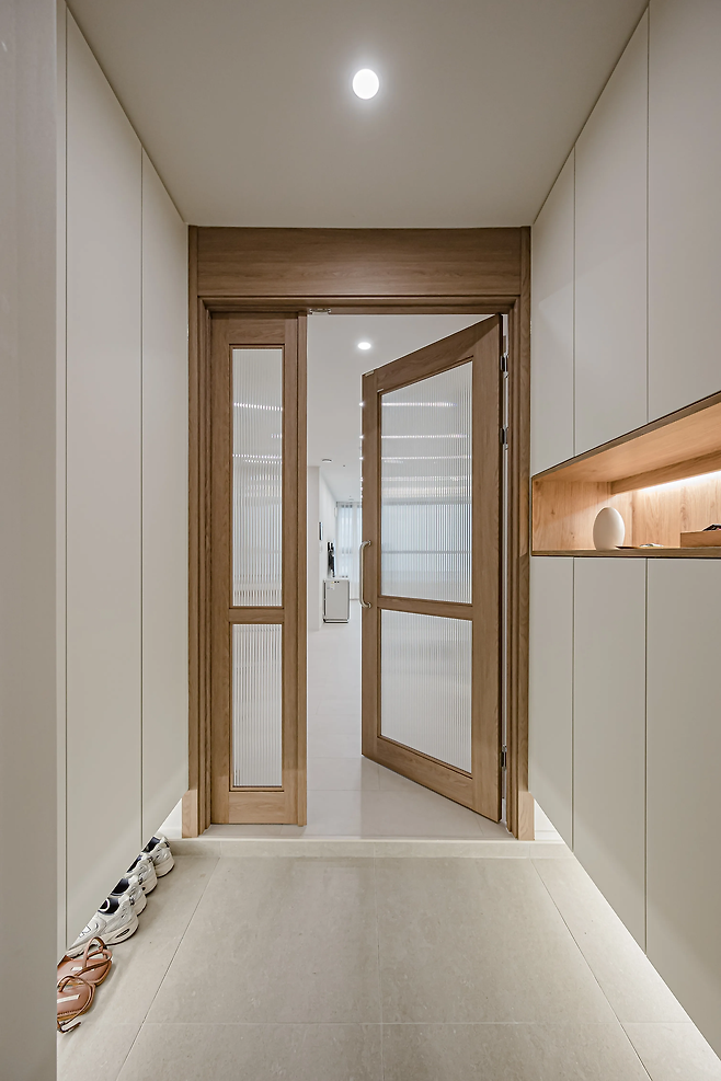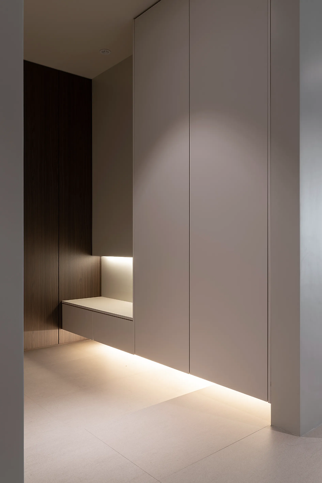 현관은 신발과 짐을 보관하는 기능을 가진 공간이므로 수납이 중요하다. 빈 벽에 빌트인 신발장을 설치한다면 공간 활용뿐만 아니라 인테리어의 완성도를 높일 수 있다. 빌트인 신발장에 거울을 부착하면 오가며 그날의 전체적인 룩을 살펴볼 수도 있고, 현관이 더 넓어 보이게 하는 착시 효과를 얻을 수 있다.