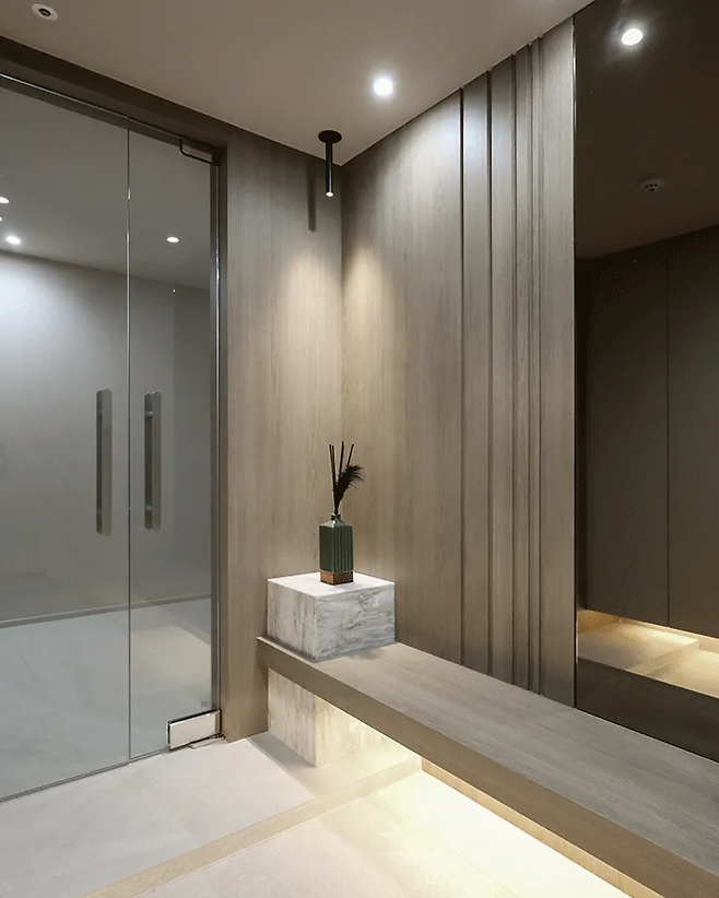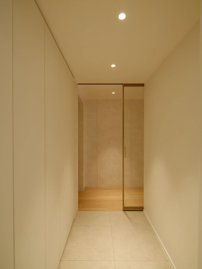 현관은 신발과 짐을 보관하는 기능을 가진 공간이므로 수납이 중요하다. 빈 벽에 빌트인 신발장을 설치한다면 공간 활용뿐만 아니라 인테리어의 완성도를 높일 수 있다. 빌트인 신발장에 거울을 부착하면 오가며 그날의 전체적인 룩을 살펴볼 수도 있고, 현관이 더 넓어 보이게 하는 착시 효과를 얻을 수 있다.