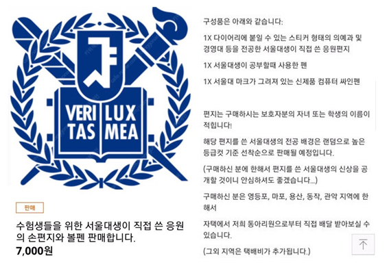 2019년에도 서울대에서 비슷한 일이 있었다. 서울대 한 창업 동아리가 “수험생들을 위해 서울대생이 직접 쓴 응원의 손 편지와 서울대생이 공부할 때 사용했던 볼펜, 서울대 마크가 그려져 있는 컴퓨터 사인펜을 7000원에 판매합니다”라는 제목의 글을 올려 문제가 됐다. 동아리 관계자는 “다른 사람보다 먼저 사면 의대·경영대 등 입시 커트라인이 높은 학과 학생의 손 편지를 받을 수 있다”며 구매 경쟁을 부추기기도 했다.
