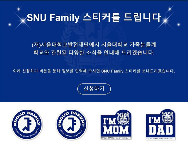 스티커에는 ‘I AM MOM(나는 서울대생 엄마)’ ‘I AM DAD(나는 서울대생 아빠)’ ‘PROUD FAMILY(자랑스러운 가족)’라는 문구와 함께 서울대 로고가 삽입돼 있다. 지난해 12월부터 이번 달까지 2100명이 해당 스티커를 받았다.