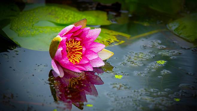 연꽃처럼 높이 솟지 않고 수면 가까이에 수줍게 피어나는 수련은 오히려 더 섬세하고 단아한 인상을 남긴다.