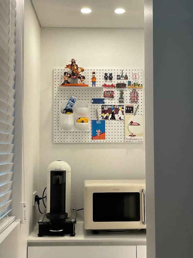 그 위 벽체에는 타공판을 설치하여 피규어를 놓았고 해외여행을 갔을 때마다 사 온 마그넷 등을 두어 귀엽게 연출해 보았습니다.ㅎ 참 귀엽죠?😆
