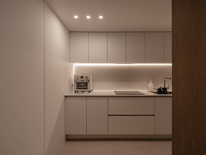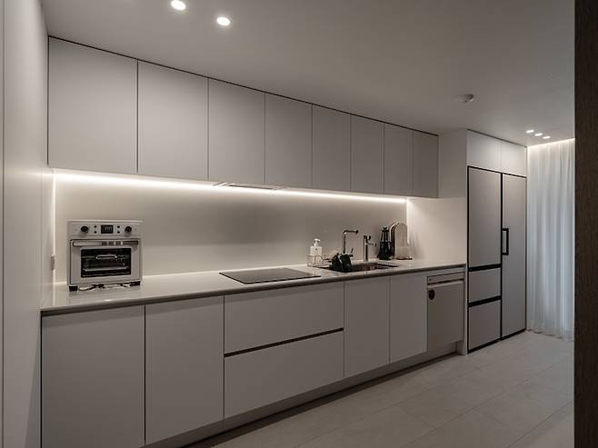 상판은 인조 대리석으로 벽면까지 말아 올려서 통일감이 느껴지게 만들었습니다. 또한, 상부장 하부에 간접등을 설치하여 무드 있는 느낌을 연출했습니다.