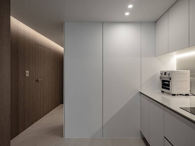 레이아웃을 변경하여 현관 앞 드레스룸을 제작했기에 자칫 답답할 수 있는 복도 부분을 월워셔 조명을 주어 좁은 복도에 확장감을 느끼게 해주었습니다.