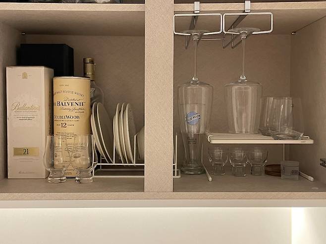 상부 수납은 그릇과 위스키로 채워두고 있습니다. 요새 위스키에 관심이 생겨 발베니, 맥켈란 등 위스키를 구매하여 마시는 걸로 소소한 취미로 즐기고 있습니다~