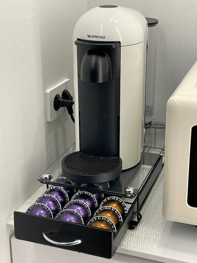 하부장은 잡동사니를 넣기 위한 자그마한 창고 공간으로 활용하고 있고, 그 위엔 커피 머신과 전자레인지를 두어 생활하고 있습니다~