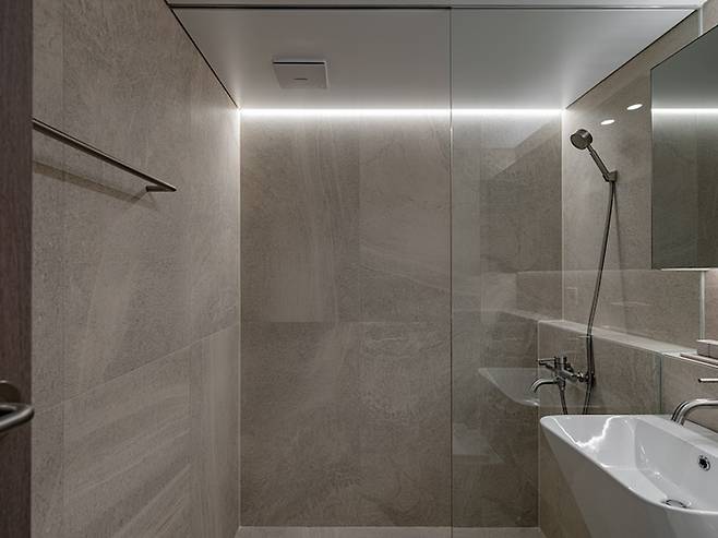 젠다이는 욕실 끝부터 끝까지 일체형으로 제작하여 통일감을 주도록 했구요. 천장은 이노솔 마감재를 사용했고, 덕분에 천장 높이도 약간 올릴 수 있었습니다