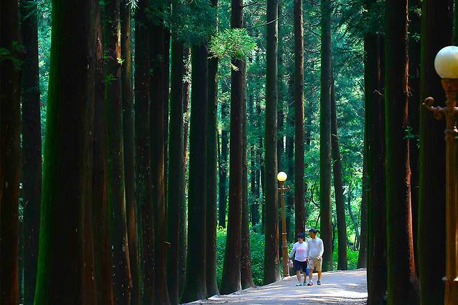 대한다원 보성 녹차밭의 관람은 입구에서부터 특별하다. 하늘을 찌를 듯이 솟은 삼나무 가로수가 줄지어 서 있어, 이 길을 걷는 순간 푸른 하늘과 초록 숲이 맞닿는 풍경을 감상할 수 있다.
