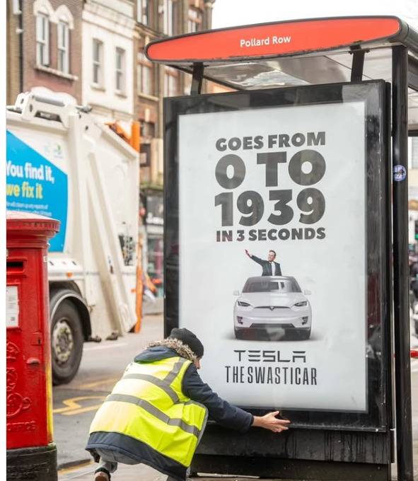 영국 런던에서는 머스크가 CEO로 있는 테슬라차를 사지 말 것을 촉구하는 포스터가 붙여졌다. 포스터에는 0에서 1939까지 3초 만에 이동이라고 적혀 있었다. 이와 더불어 나치 경례를 하는 머스크 사진과 함께 Swasticar라고 적혀 있다.