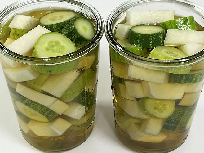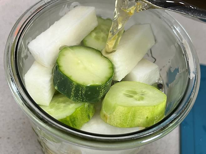무와 오이를 소독한 유리병에 담아 주세요. 유리병은 부식이나 화학반응이 일어나지 않아 피클을 담기에 가장 적합한 소재입니다.