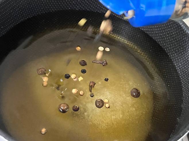 그리고 피클 스파이시(향신료)가 있으면 소량 넣으세요. 월계수잎을 넣어도 좋습니다. 만일 향신료가 없으시면 생략하셔도 됩니다. 설탕이 모두 녹을 때까지만 끓여 주세요.