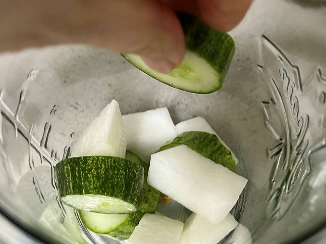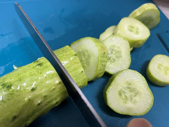 오이와 무는 적당한 두께로 썰어 주세요. 피클을 며칠 보관하면 간이 배기 때문에 두께가 살짝 있게 써는 것이 좋습니다.