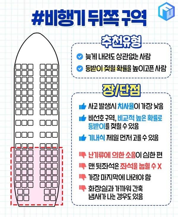 가장 늦게 비행기에서 내려야 해 시간이 여유로운 분들에게 추천하는데요. 뒷쪽의 화장실을 이용하려는 사람들로 어수선한 분위기가 형성될 수 있기도 합니다. 기체가 좁아지며 좌석 간 통로가 함께 좁아지는 경우도 있습니다.