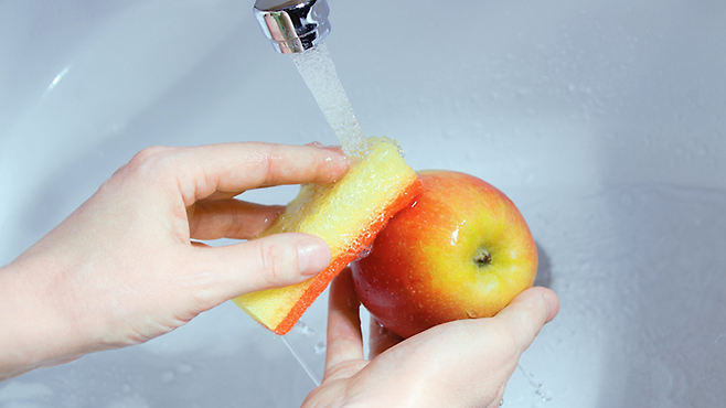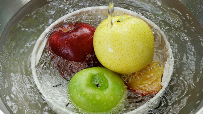 채소와 과일의 표면에 남은 농약은 대부분 물에 잘 녹는 수용성 성분이다. 따라서 흐르는 물에 30초 이상 비비며 씻는 것만으로도 잔류 농약의 절반 이상이 제거된다는 연구 결과가 있다.