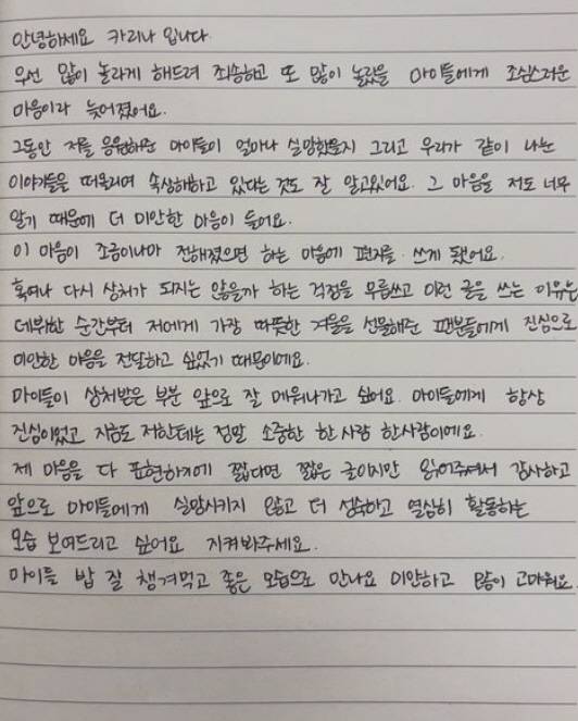 에스파 카리나가 결국 사과의 손편지를 썼다.