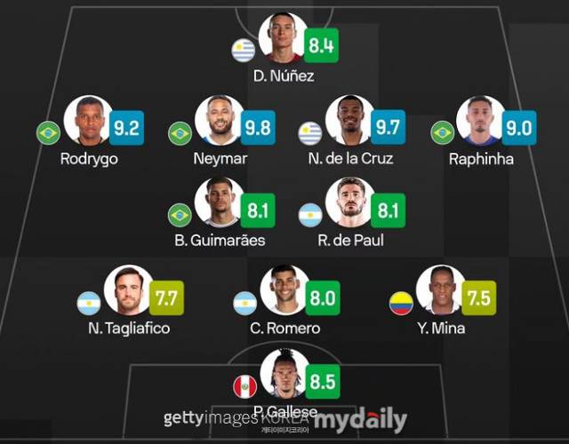 북중미월드컵 남미예선 1차전 베스트11 공격수에는 누녜스(우루과이)가 선정됐고 미드필더에는 호드리구(브라질), 네이마르(브라질), 데 라 크루즈(우루과이), 하피냐(브라질), 기마량이스(브라질), 데 파울(아르헨티나)이 이름을 올렸다. 수비수로는 타글리아피코(아르헨티나), 로메로(아르헨티나), 미나(콜롬비아)가 선정됐고 골키퍼에는 갈레세(페루)가 이름을 올렸다.