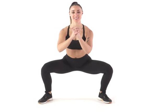 양발을 어깨 넓이보다 1.5배 넓게 벌리고 발끝은 바깥쪽을 향하게 합니다. 무릎을 굽혀 앉을 때 허벅지 안쪽이 늘어나는 느낌을 주고, 다시 일어날 때 허벅지 안쪽을 조여주며 올라옵니다.