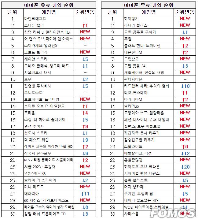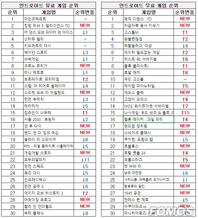 유료 게임 순위에서도 '킹덤 러쉬 5: 얼라이언스 TD'가 2위를 차지하는 등 무료 게임 순위와 유료 게임 순위 모두 디펜스 장르의 게임이 상위권을 기록했다.