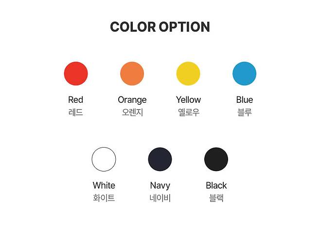 다양한 컬러를 선택할 수 있도록 기본 컬러는 물론 레드, 오렌지, 옐로우, 블루 컬러까지 있습니다!
