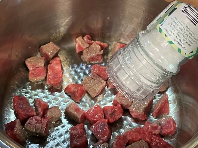 또한 소금, 후추로 밑간을 이때 해주세요. 이렇게 해야 각 재료야 간이 배어 나중에 카레 가루를 넣었을 때 재료의 맛이 겉돌지 않습니다.