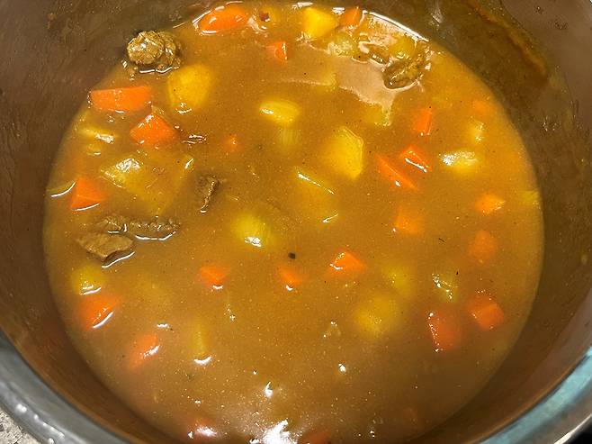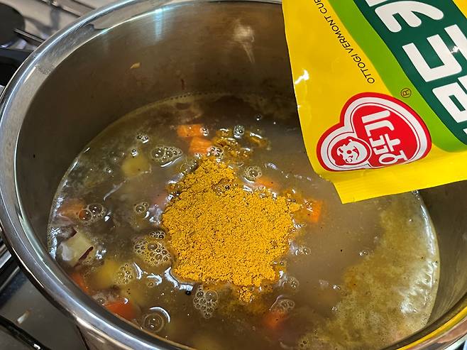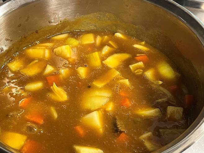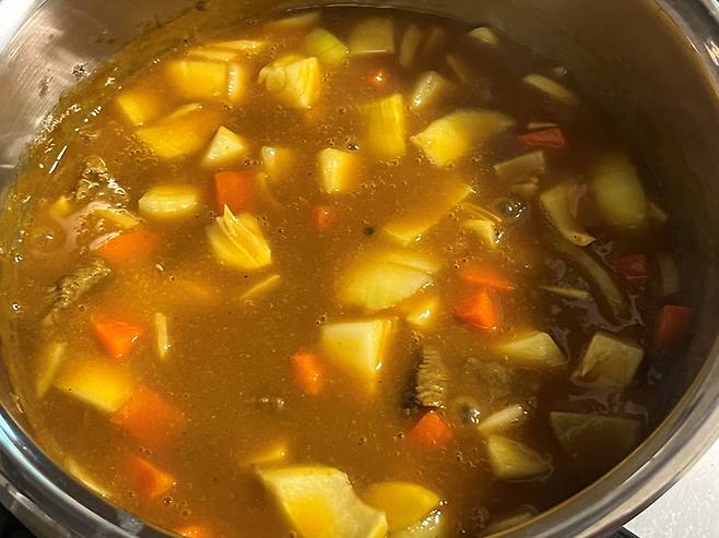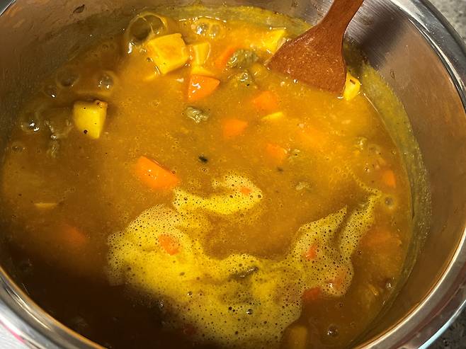 바닥에 눌어붙지 않도록 주걱으로 살살 저어가며 한소끔 끓여주세요. 따뜻한 물을 사용했기에 카레 가루가 겉돌지 않고 재료들과 금세 어우러져, 걸쭉하면서도 윤기가 흐르는 먹음직스러운 농도가 잡히기 시작합니다.