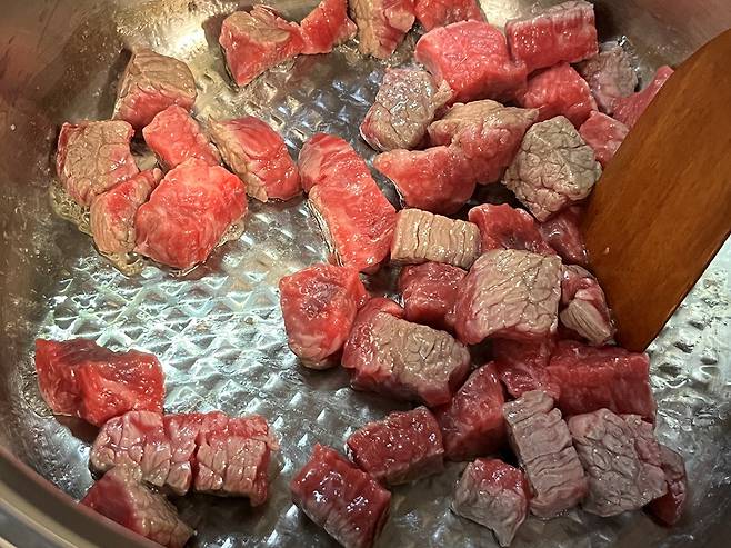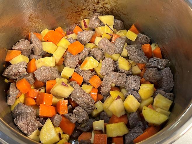 고기의 붉은 기가 사라질 때쯤 썰어둔 고구마와 당근 같은 딱딱한 채소들을 차례로 넣어 함께 볶아줍니다. 이렇게 고기 기름에 채소를 같이 볶으면 재료마다 풍미가 깊게 스며들게 됩니다.