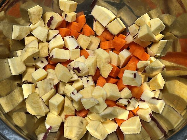 고구마, 양파, 당근 등은 먹기 좋은 크기로 썰어서 준비해 주세요. 카레 끓일 때는 고구마, 감자, 당근 같은 딱딱한 딱딱한 채소들을 먼저 볶고, 양파나 파프리카 등을 나중에 넣는 것이 핵심입니다.